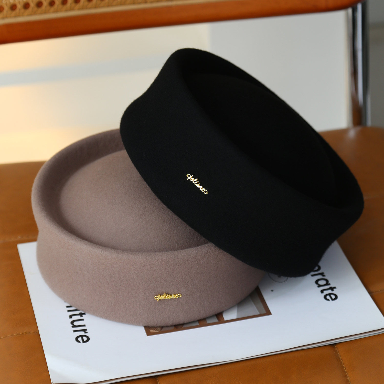 新款法式秋冬平顶羊毛呢礼帽子女平沿小沿英伦大头围百搭驼色黑色