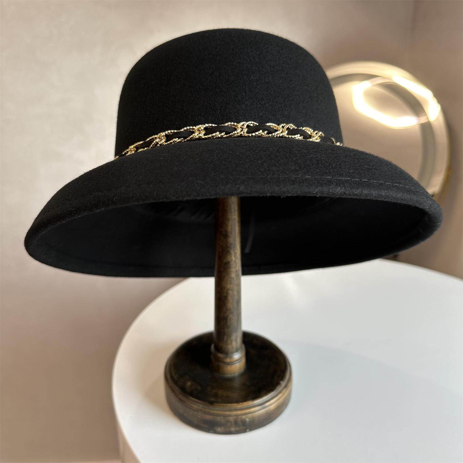 小香风渔夫帽女秋冬法式复古赫本风盆帽黑色羊毛呢礼帽显脸小帽子