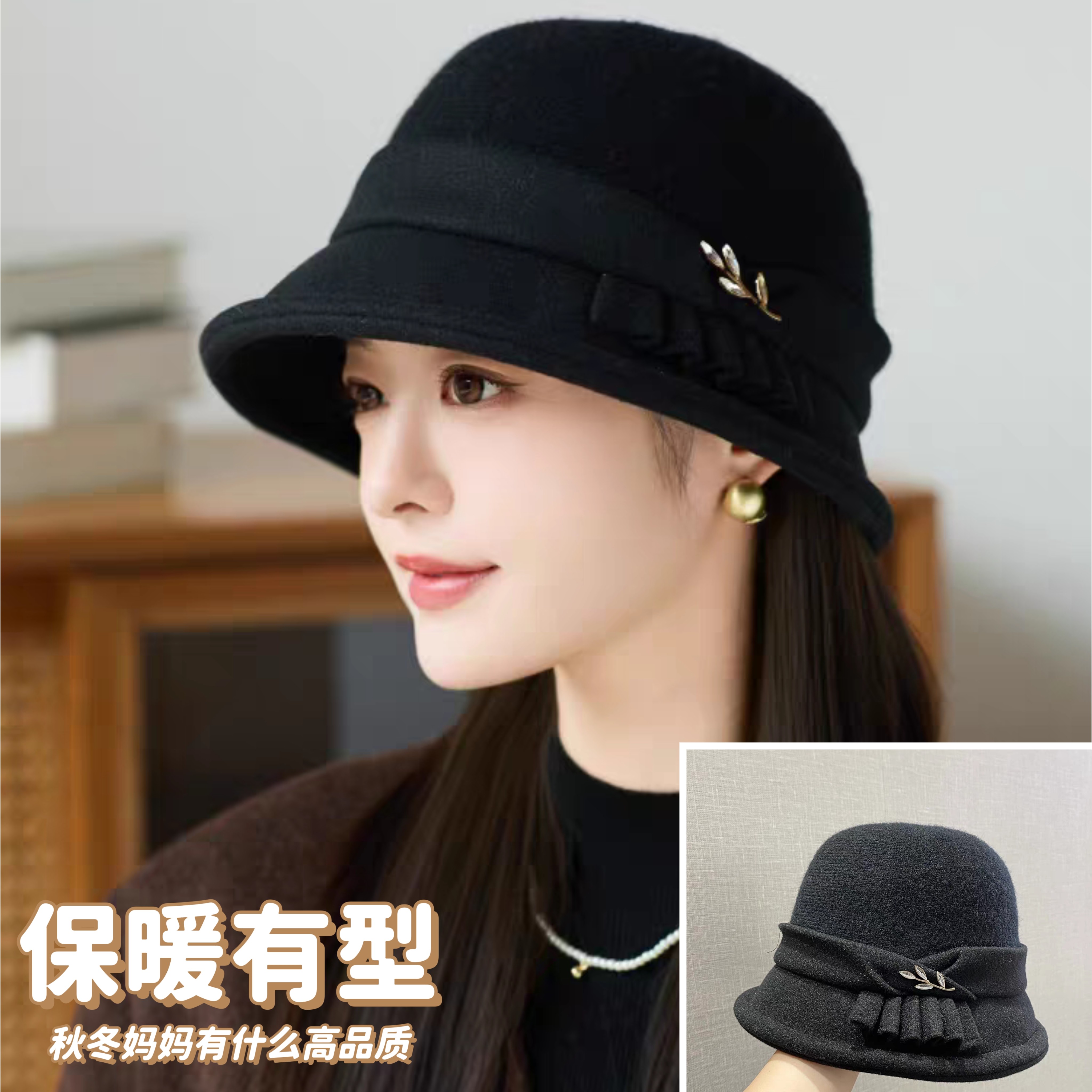 秋冬季中老年人帽子女妈妈盆帽加厚保暖羊毛呢礼帽冬天婆婆奶奶帽