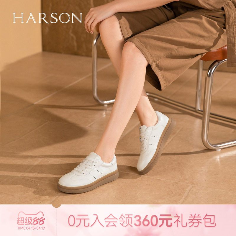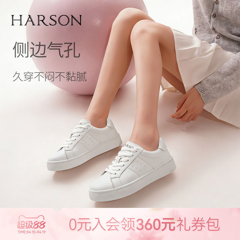 哈森真皮小白鞋女2026春季新款平底系带休闲鞋软底轻便透气板鞋