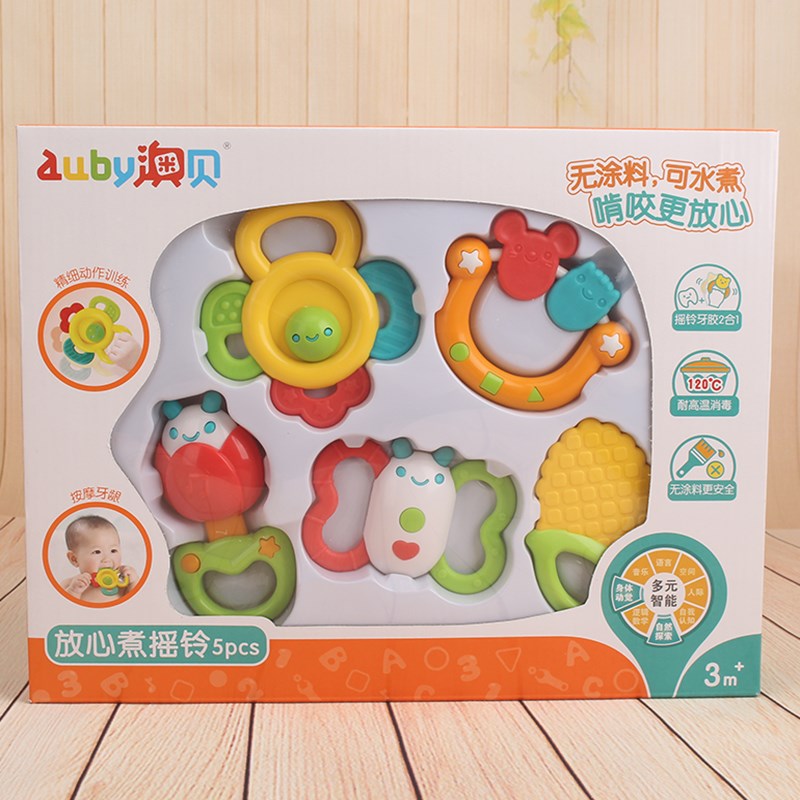 澳贝可啃咬手持硅胶摇铃婴儿5只牙胶床铃乐器新生男女孩益智玩具