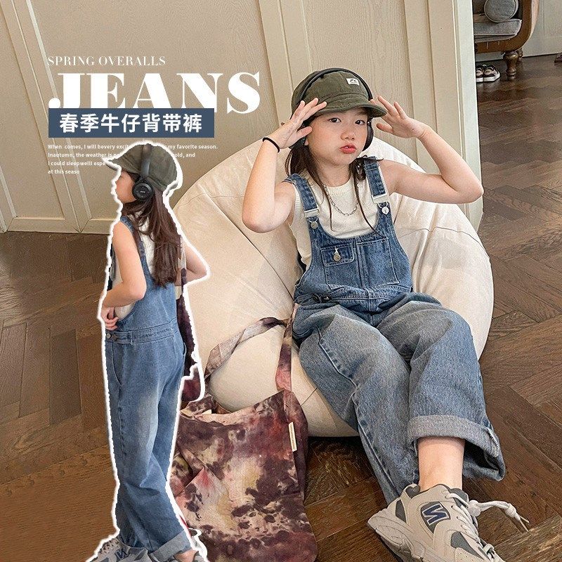 2024春秋季新款儿童休闲背带裤女童洋气时尚阔腿裤大童韩版牛仔裤