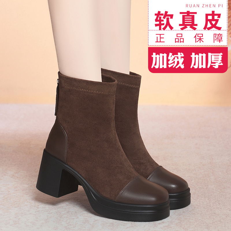 2025秋冬新款英伦风马丁靴女厚底粗跟圆头短筒靴真皮复古加绒棉靴