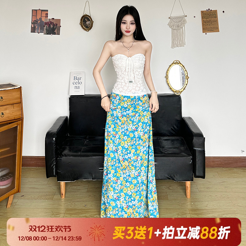Amyway【海边度假】纯欲辣妹系带抹胸露背无袖碎花半身裙两件套