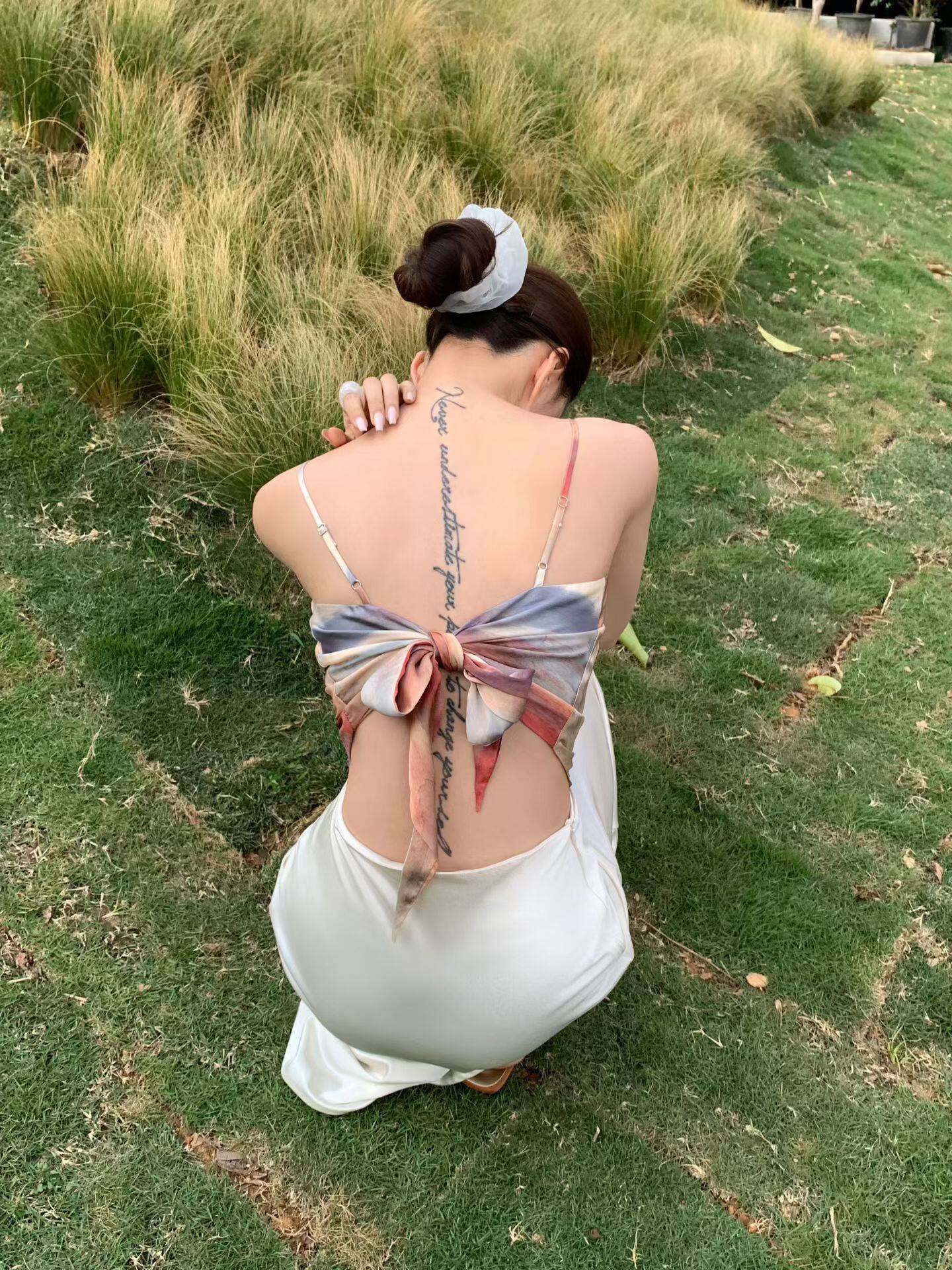 法式浪漫气质晕染印花醋酸缎面吊带上衣外穿丝巾抹胸露背绑蝴蝶结
