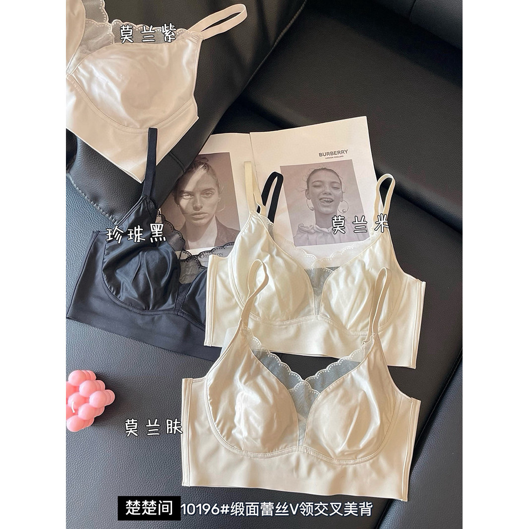 新品缎面蕾丝V领美背内衣吊带女兔耳朵杯大胸显小抹胸露背文胸罩