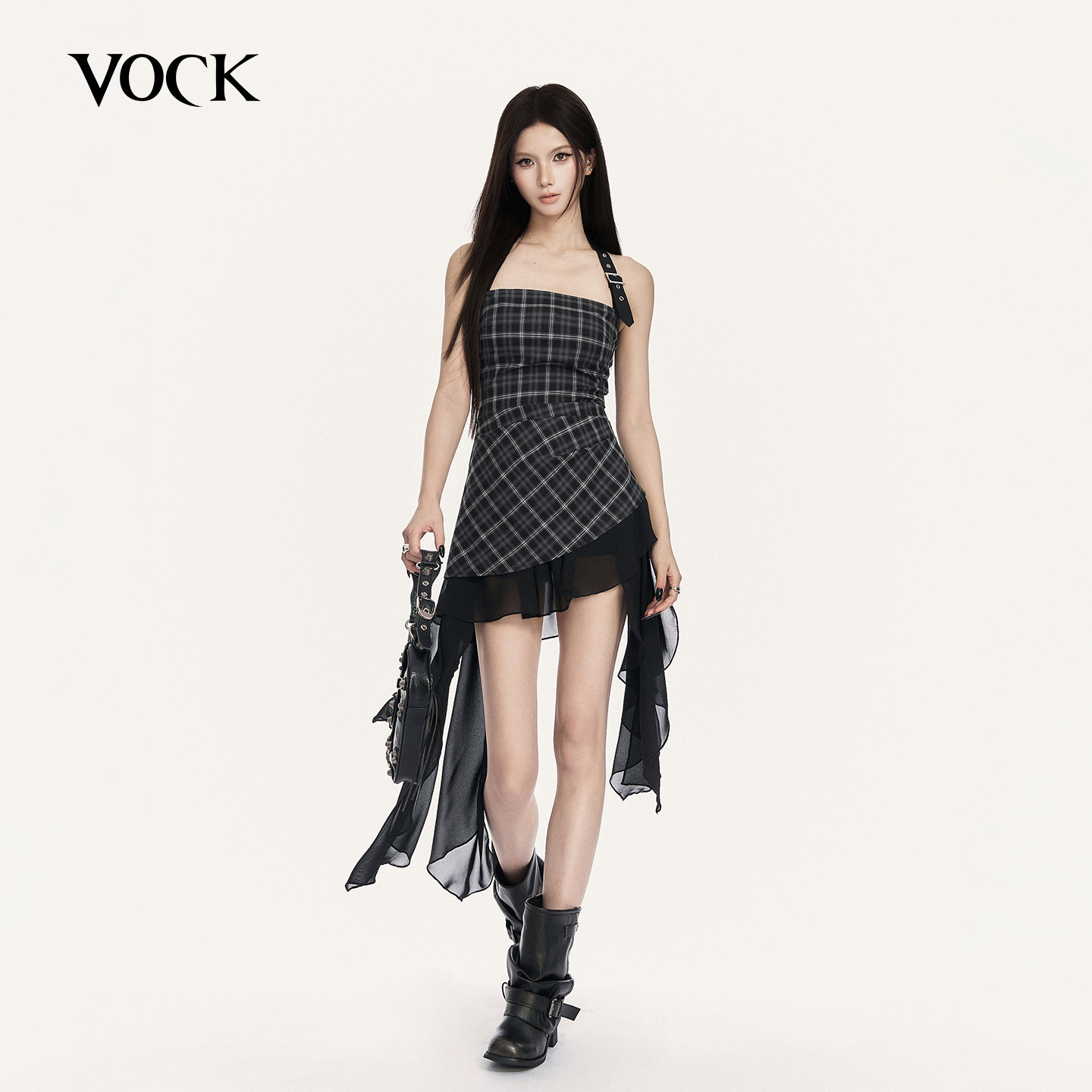 VOCK 浪漫攻势 设计感不规则荷叶挂脖抹胸露背格子上衣音乐节辣妹