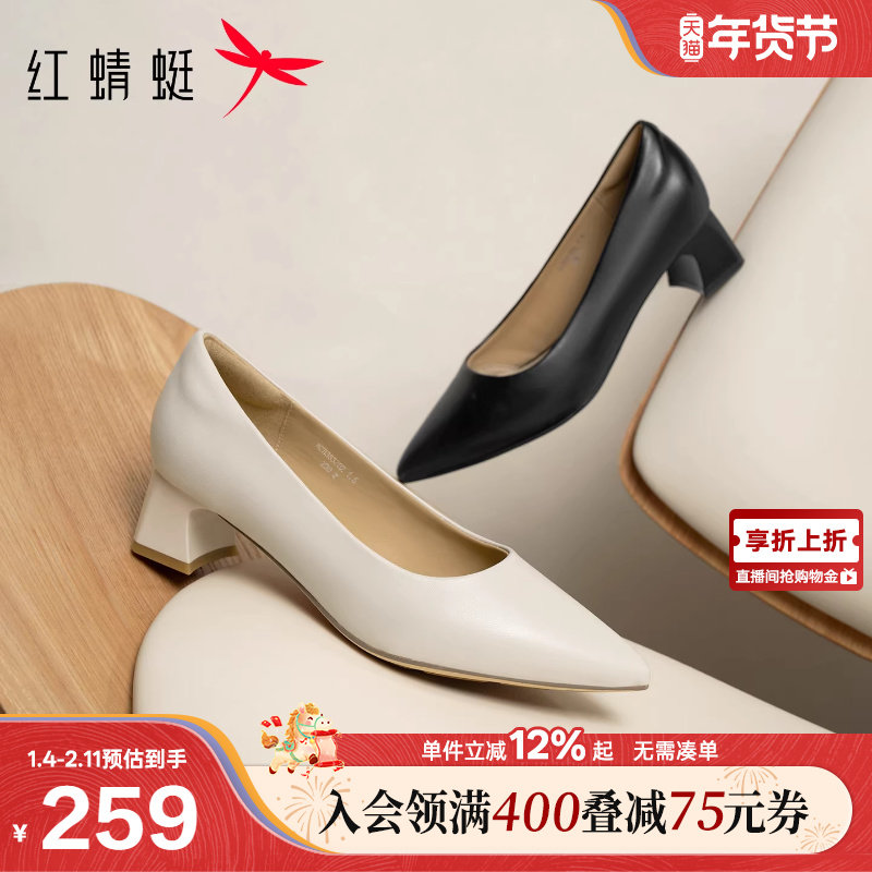 红蜻蜓高跟鞋春季新款女鞋白色气质羊皮单鞋黑色职业通勤公务皮鞋