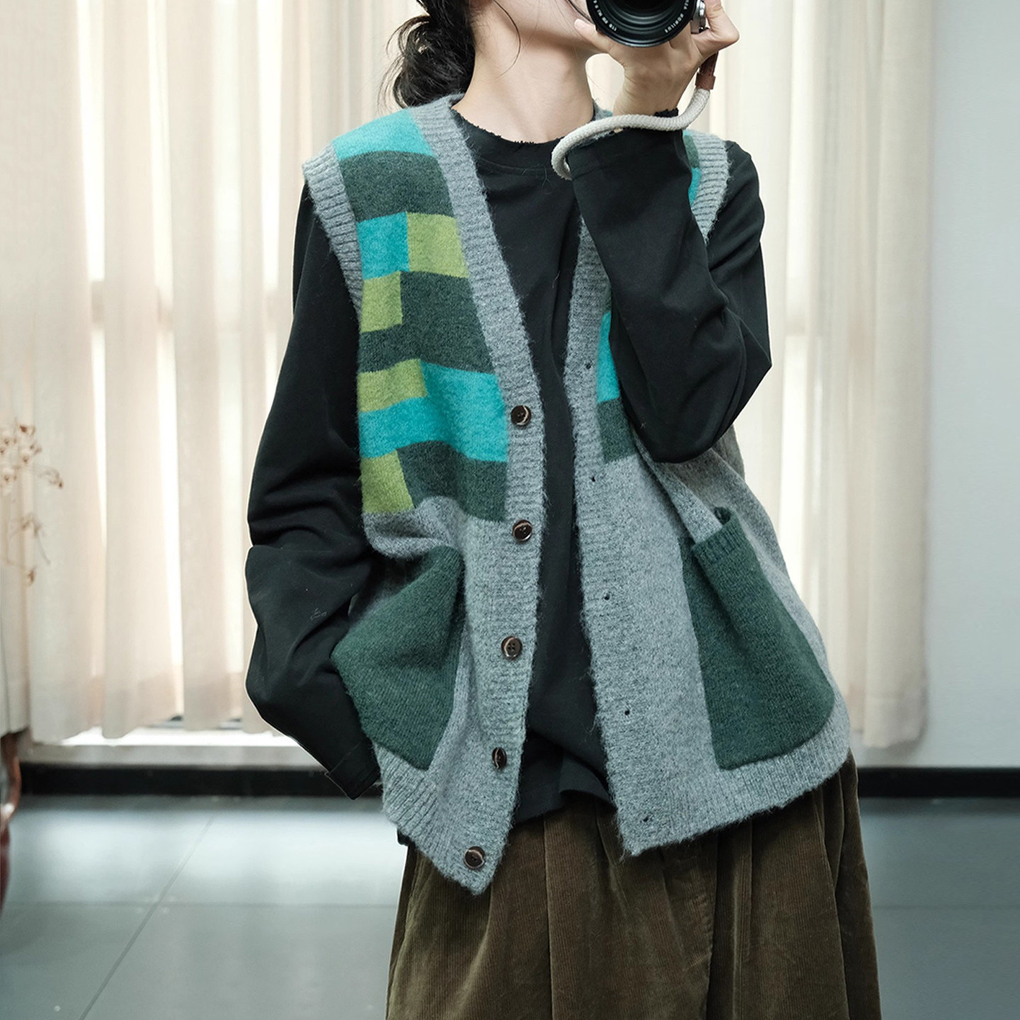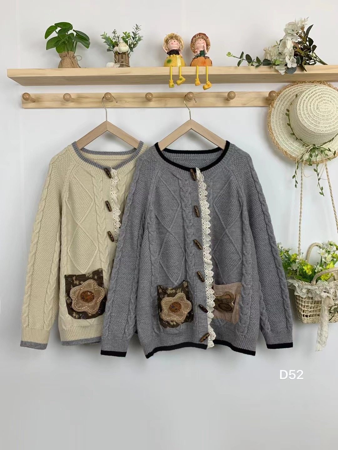森女系圆领菱形格蕾丝边门襟拼接拼布大口袋毛衣开衫宽大版外套女