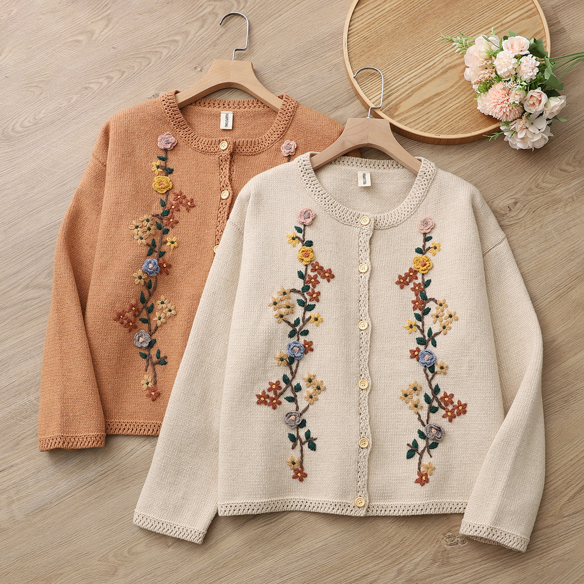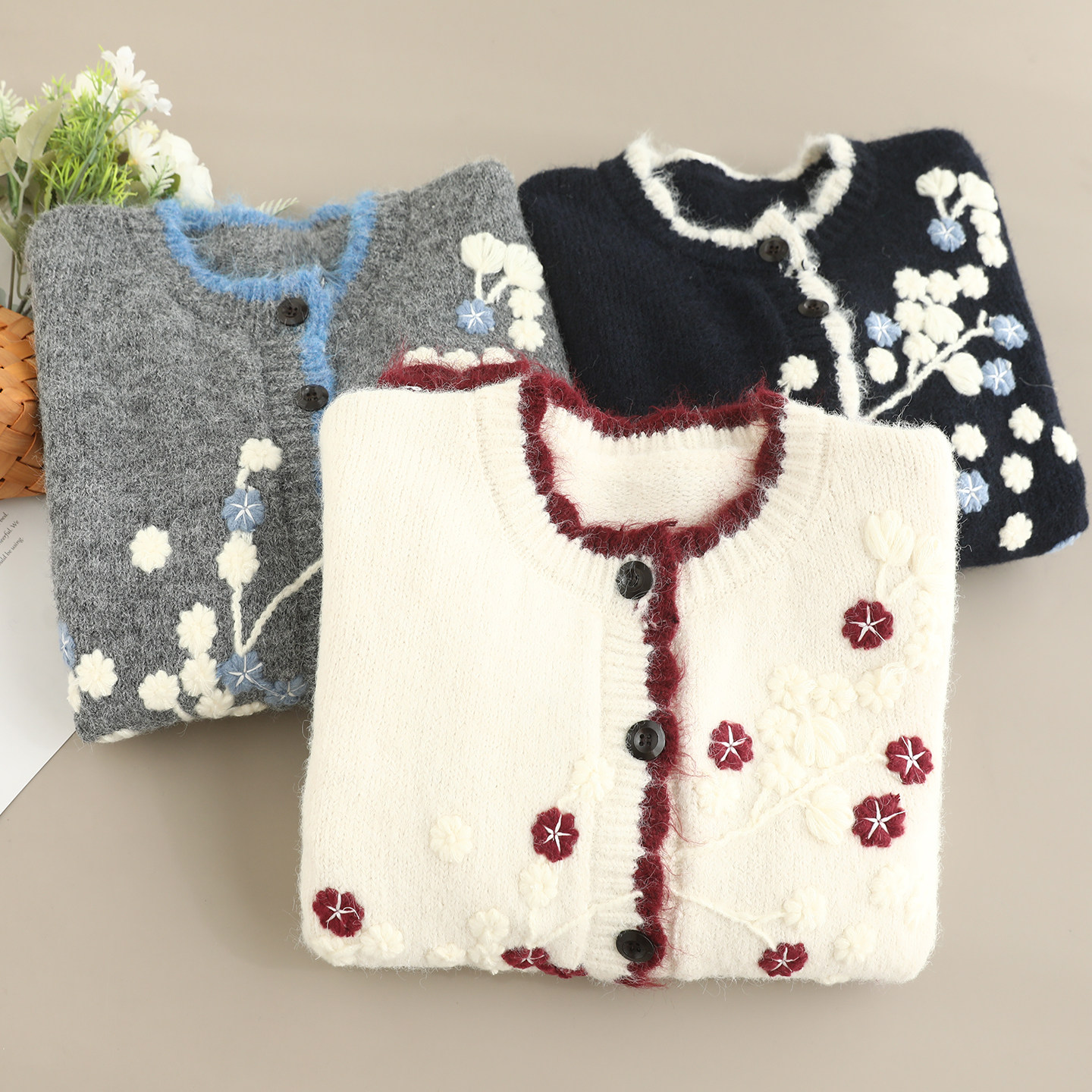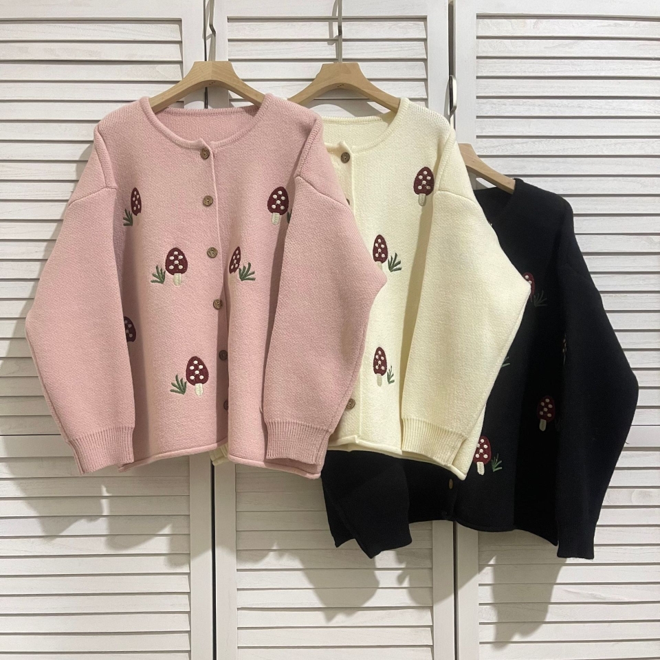 日系森女文艺圆领单排扣蘑菇刺绣软糯毛衣开衫外套减龄针织衫上衣