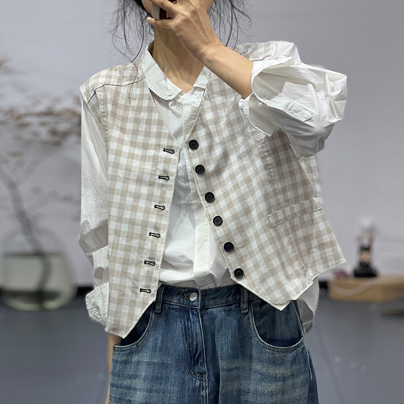 素凡卡春季新款日系森女文艺格子单排扣圆领外套宽松显瘦百搭马甲