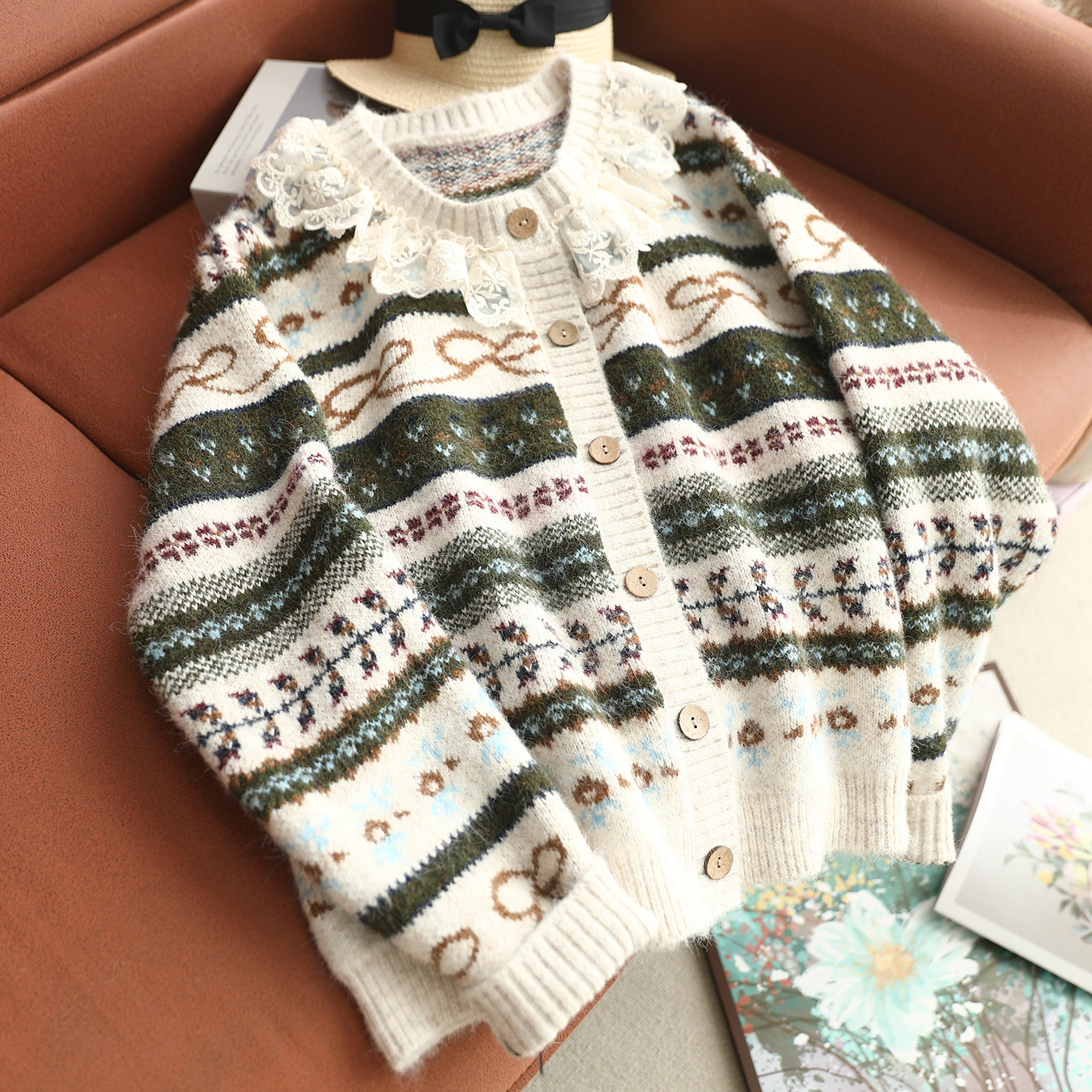 森女系新款蕾丝花边圆领针织开衫女宽松百搭文艺织花减龄毛衣外套