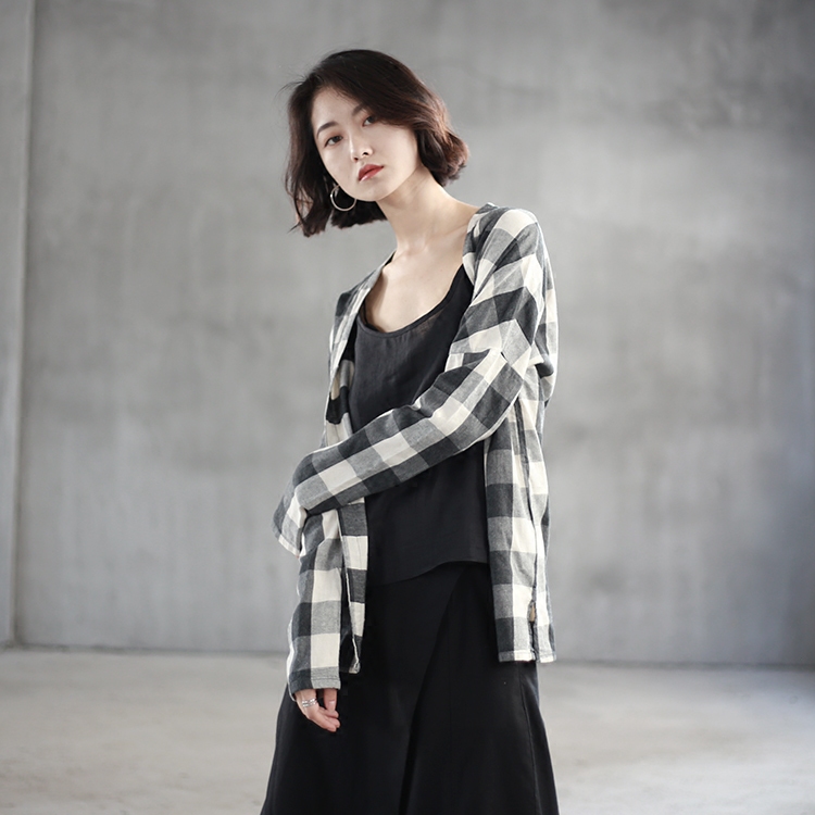 2020春文艺简约开衫无扣长袖格子外套格纹防晒外披森女系显瘦衬衫