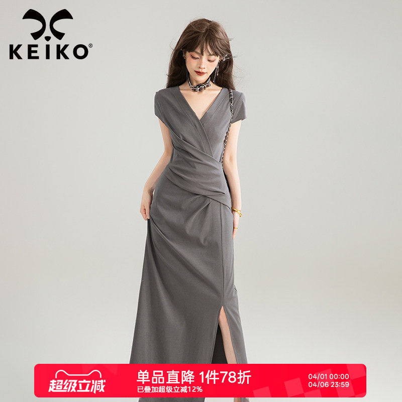 KEIKO 交叠V领灰色长款连衣裙夏季新款气质独特漂亮掐腰显瘦长裙