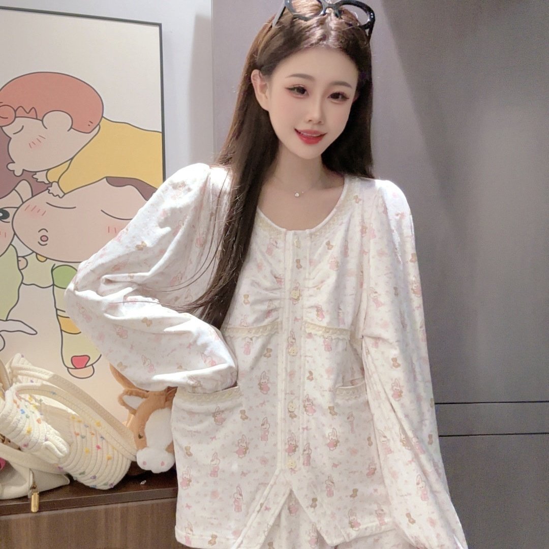 润微纯棉开衫长袖秋季清新甜美翻领纯棉长袖睡衣女士家居服可外穿