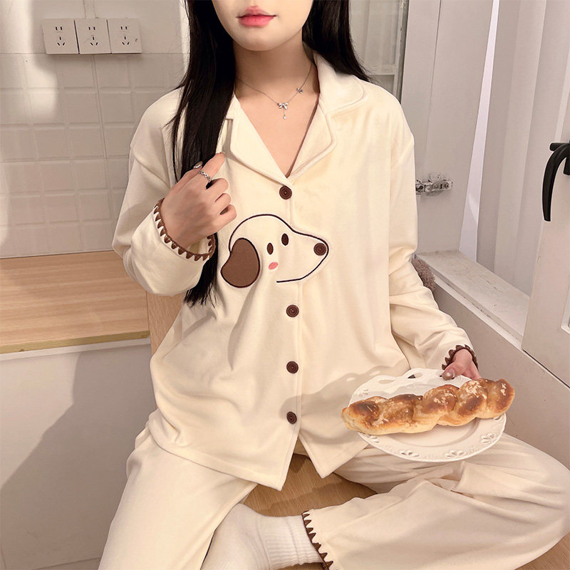 ins风可爱小狗长袖睡衣女秋冬季款海岛绒休闲保暖可外穿开衫套装