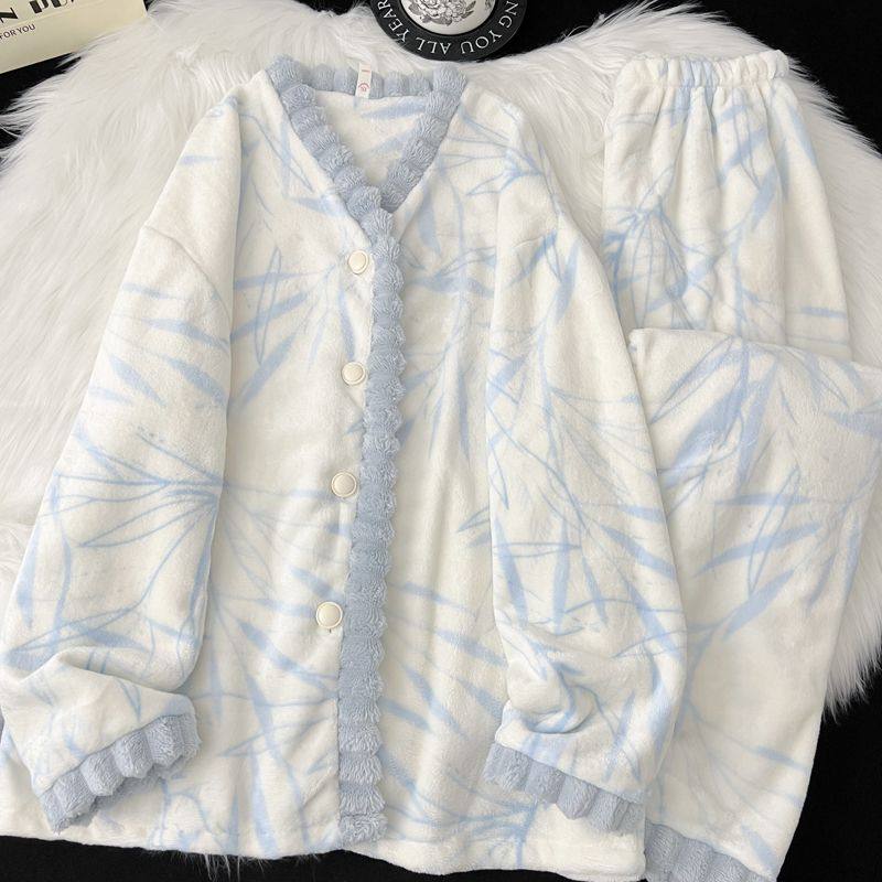 法兰绒软绵绵加厚长袖睡衣女款冬季2025新款V领家居服网红风套装