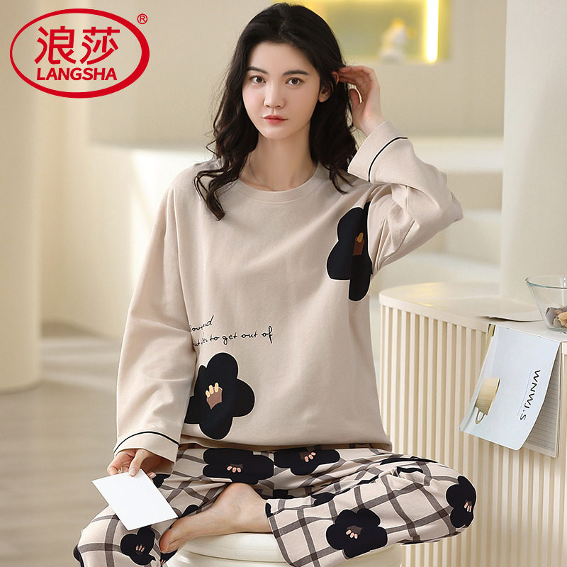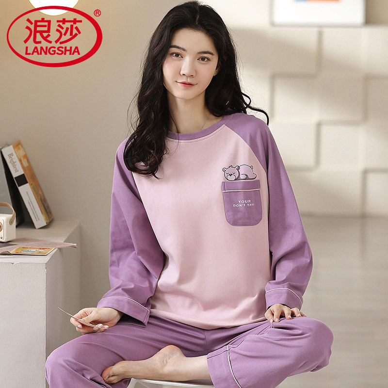 浪莎春秋季长袖睡衣女士薄款纯棉宽松大码休闲套头家居服可爱套装