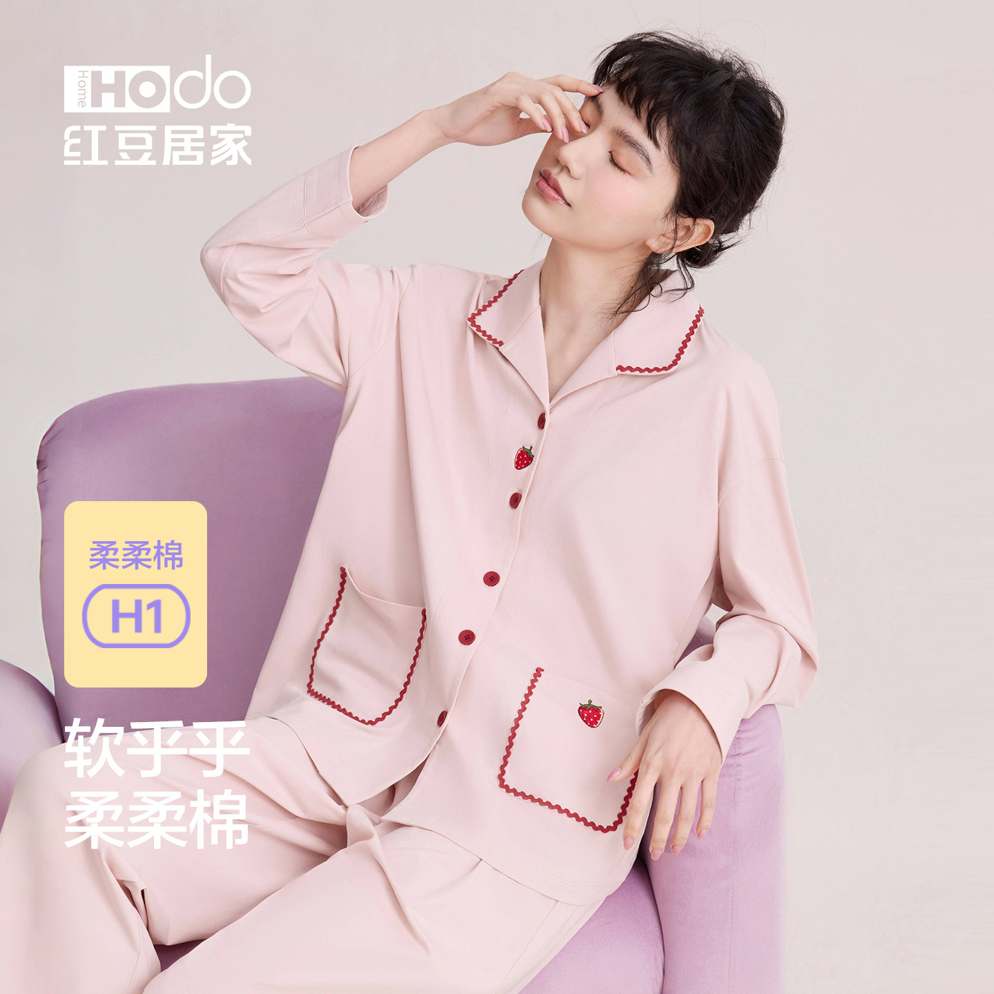 【柔柔棉】红豆居家柔软春秋季长袖睡衣女甜美宽松草莓家居服套装