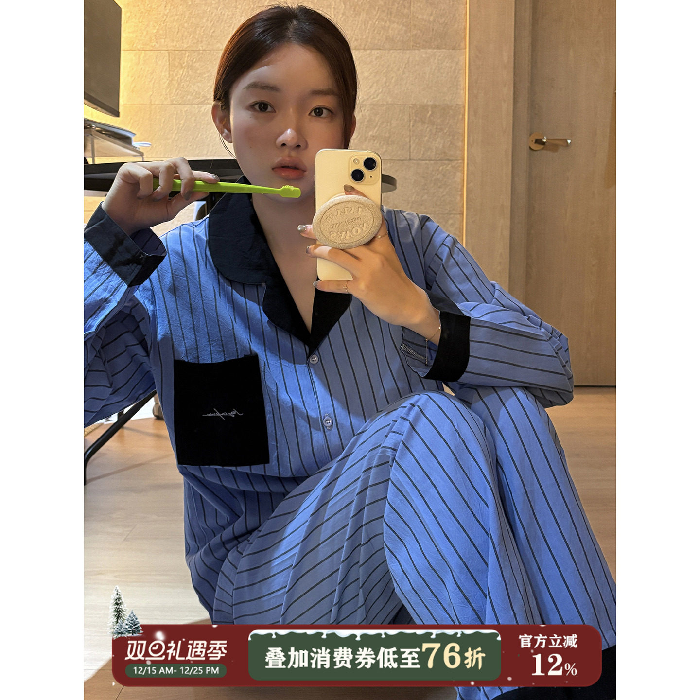 JoyceBra翻领条纹优质棉长袖睡衣女秋季舒适亲肤可外穿家居服套装