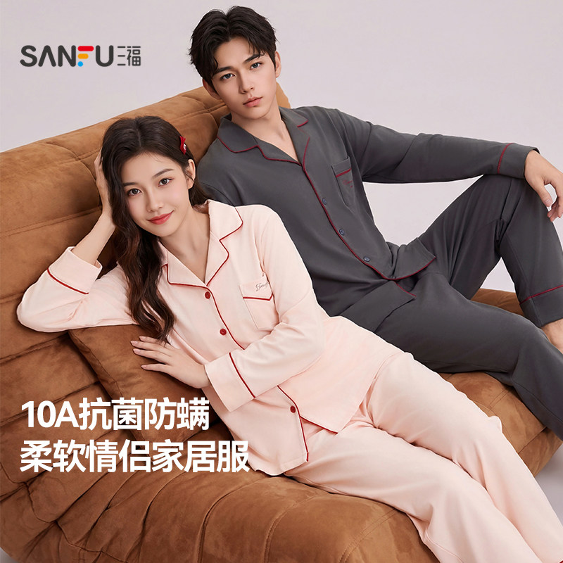 【抗菌防螨】三福2026春季情侣装长袖睡衣女套装宽松棉质男家居服