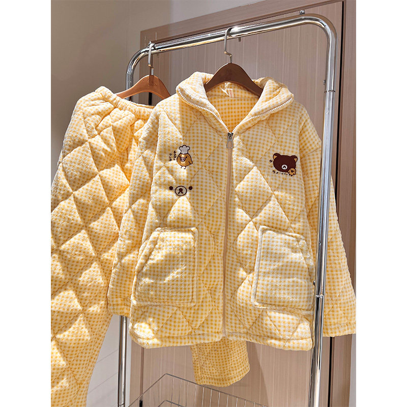 软萌卡通印花格子夹棉长袖睡衣女秋冬季新款家居服保暖套装可外穿