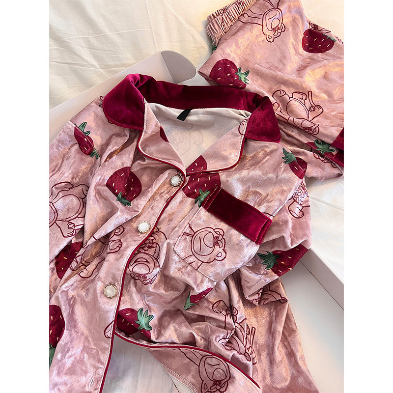 韩版甜美草莓熊印花金丝绒长袖睡衣女秋冬季新款家居服加厚两件套