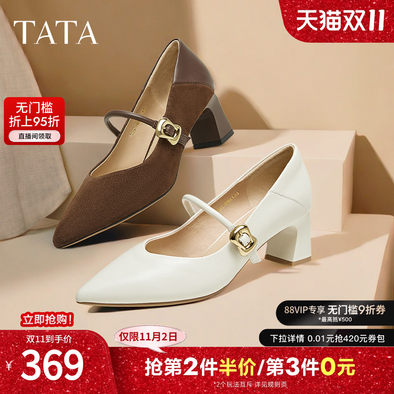 TATA他她女鞋粗跟玛丽珍鞋黑色高跟鞋小皮鞋2025羊皮单鞋XGM01AQ5