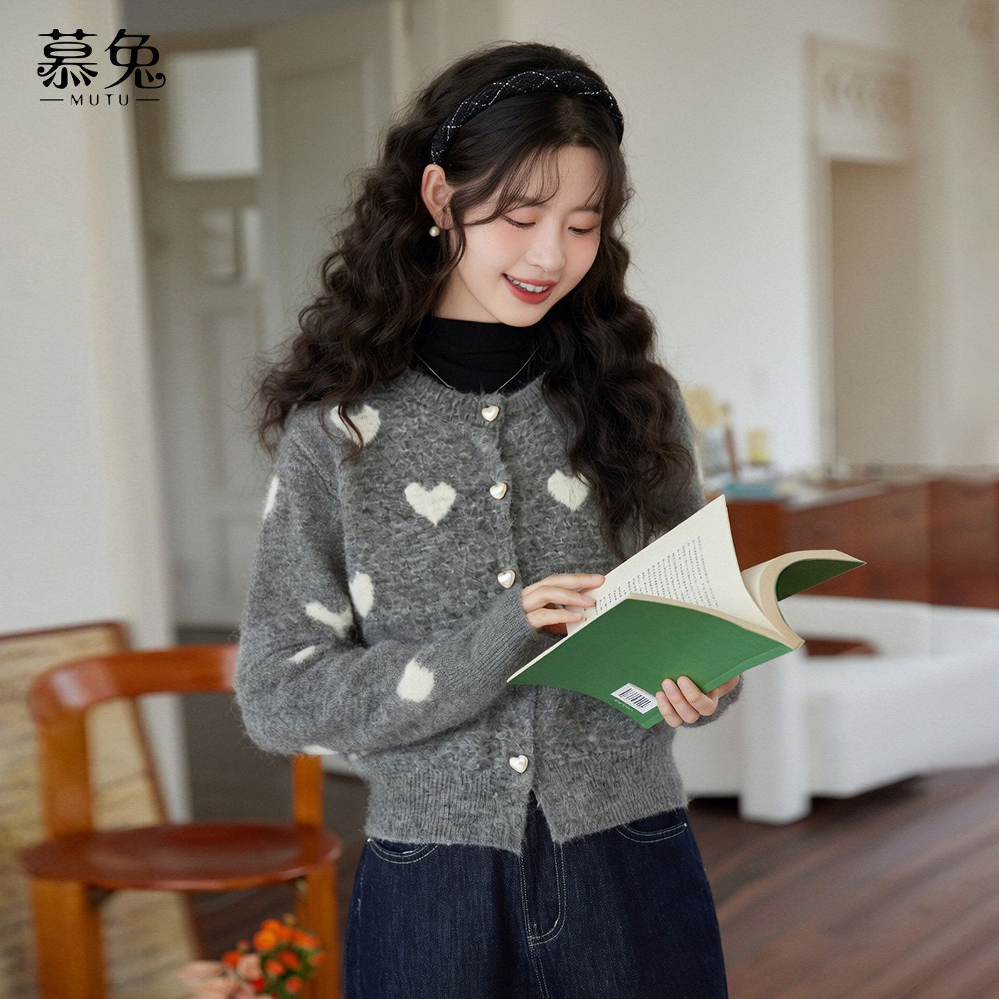 慕兔韩系爱心花纹毛衣外套女2025冬季新款慵懒风宽松针织开衫上衣