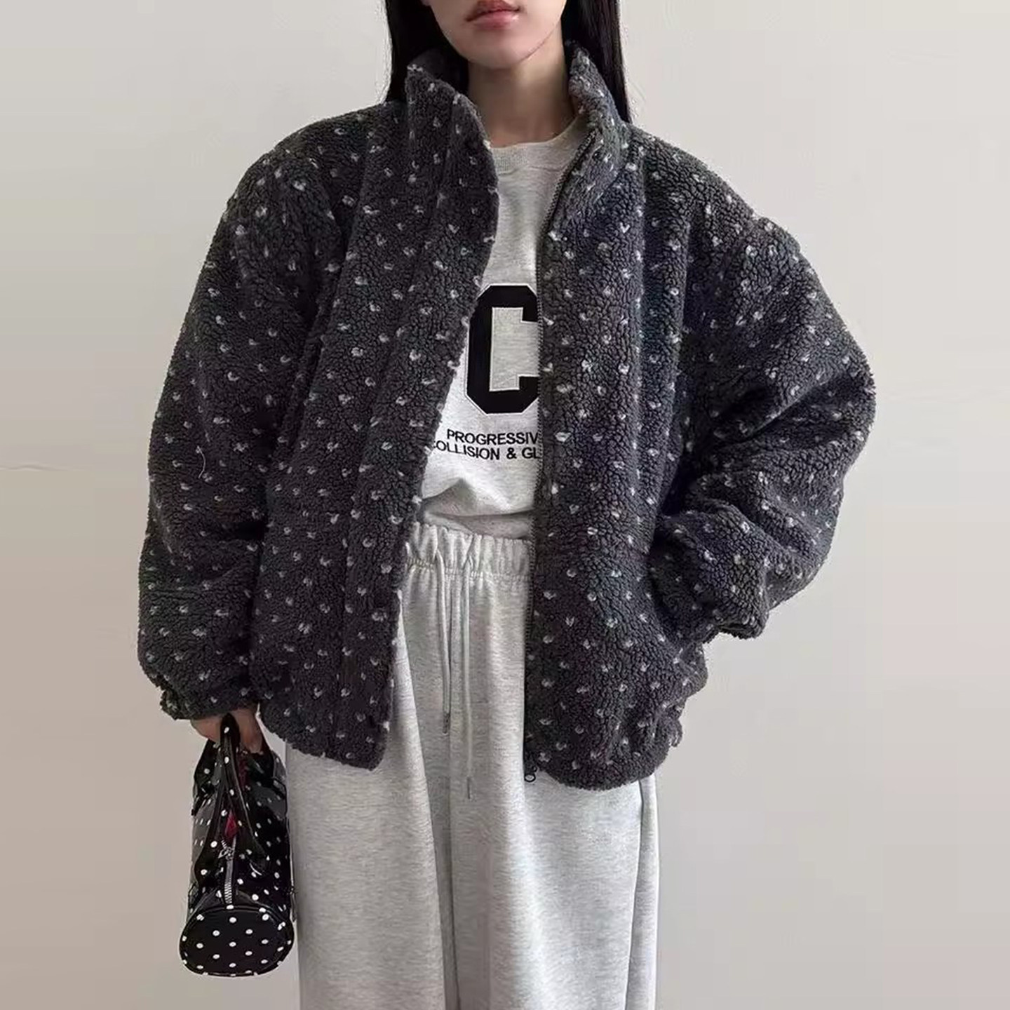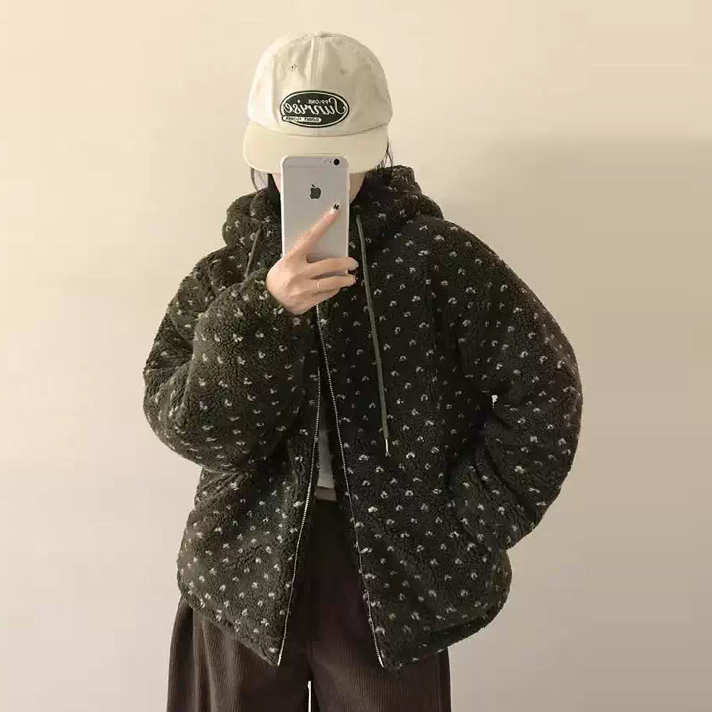 羊羔毛绒绒爱心波点连帽外套女秋冬加厚保暖棉衣韩系复古咖色棉袄
