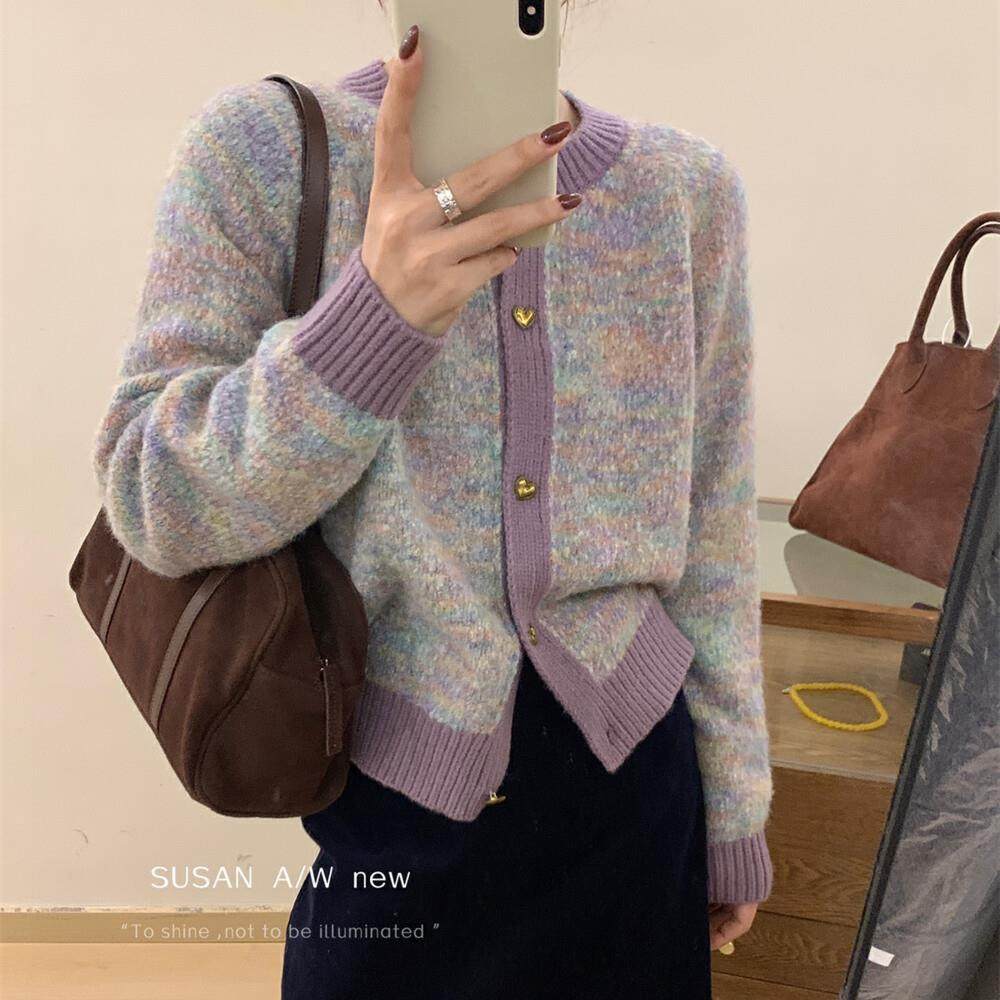 羊毛爱心扣休闲韩系圆领花纱紫秋冬新款针织开衫宽松显瘦毛衣外套
