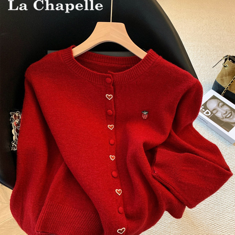 新年圣诞红色纽扣爱心毛衣外套女秋冬季宽松软糯韩系百搭针织开衫