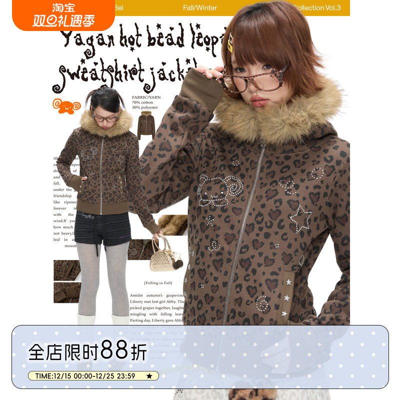 BETWEENAND 古早亚感爱心豹纹烫珠卫衣女短款加绒暖和毛领外套冬