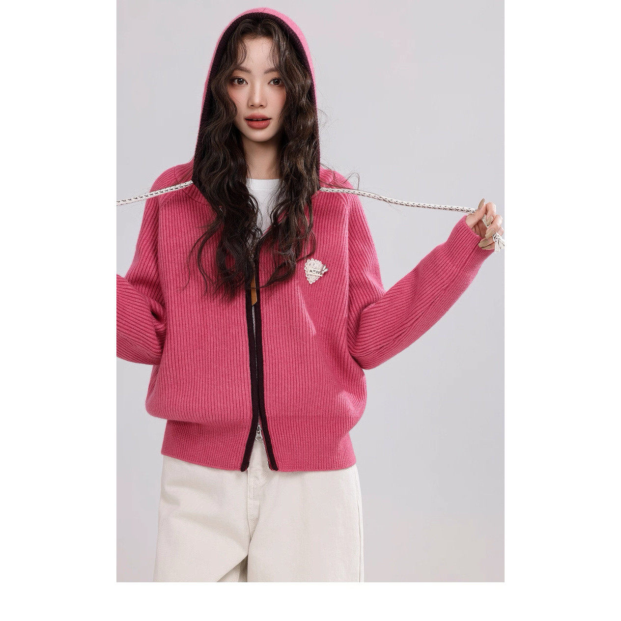 【小四粉丝专享】韩系连帽撞色蕾丝爱心加厚针织开衫外套#852