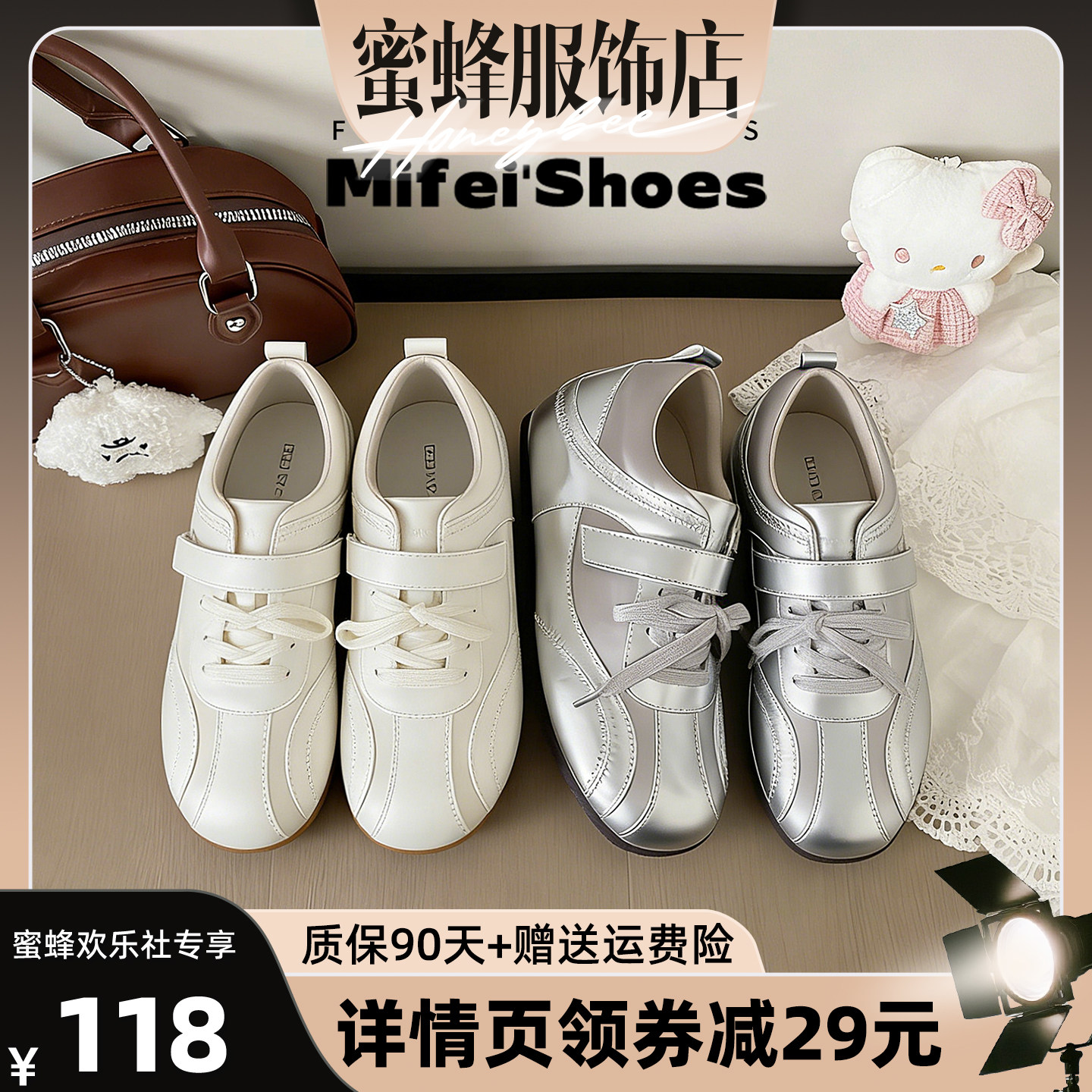 15mins魔术贴银色德训鞋女2026新款春季系带内增高休闲鞋平底板鞋
