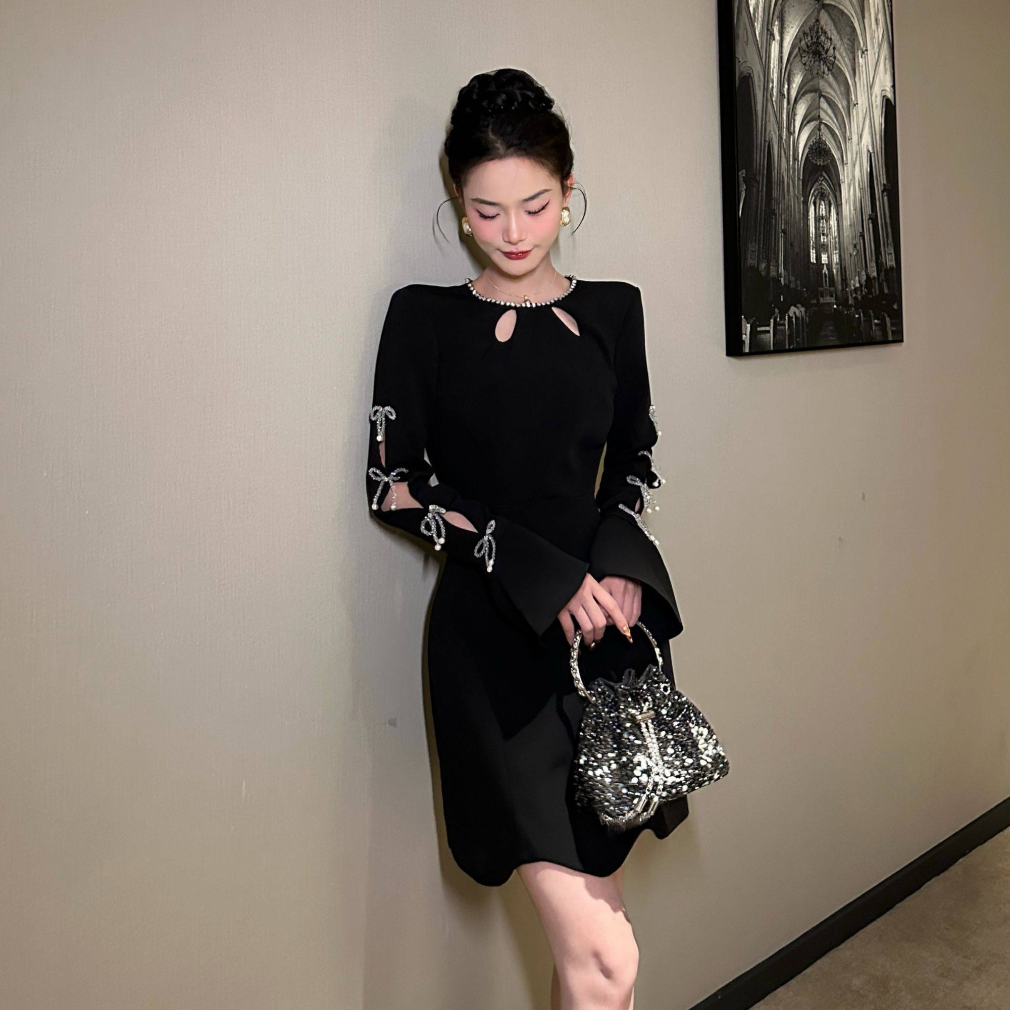 黑色连衣裙女秋冬季法式名媛设计感镂空小众收腰显瘦短款宴会礼服