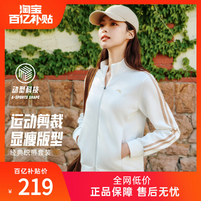 安踏运动套装女秋冬穿搭休闲美式立领修身运动外套校服裤针织长裤