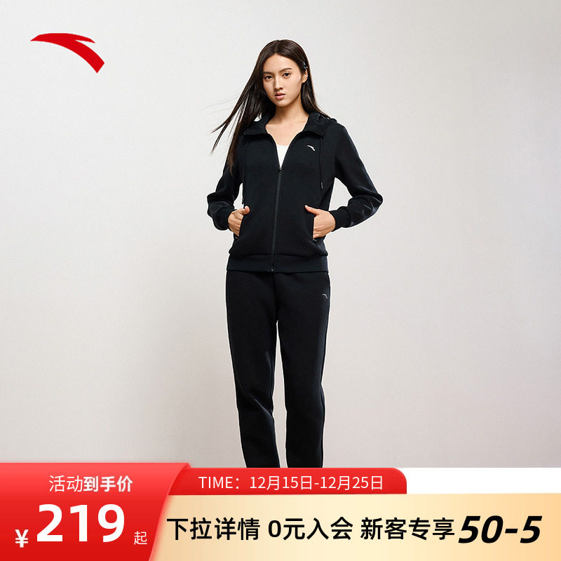 安踏运动套装女2025新款秋冬黑色开衫连帽外套长裤休闲跑步两件套