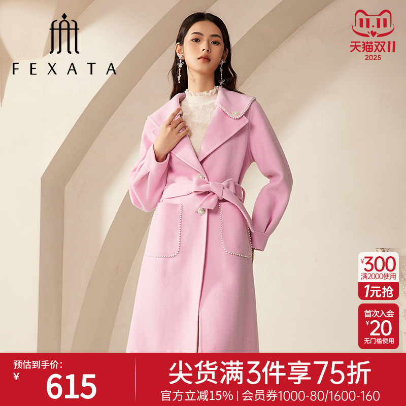 FEXATA斐格思2025冬季保暖毛呢外套钉珠收腰粉色中长款羊毛大衣女