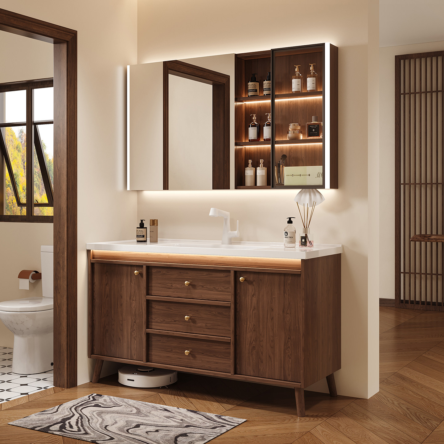 中古风胡桃木陶瓷一体盆落地式浴室柜组合卫生间洗手盆洗脸洗漱台