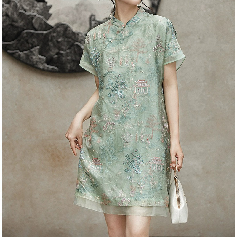 新中式夏季国风真丝欧根纱连衣裙轻奢高级感100%桑蚕丝高定款无袖