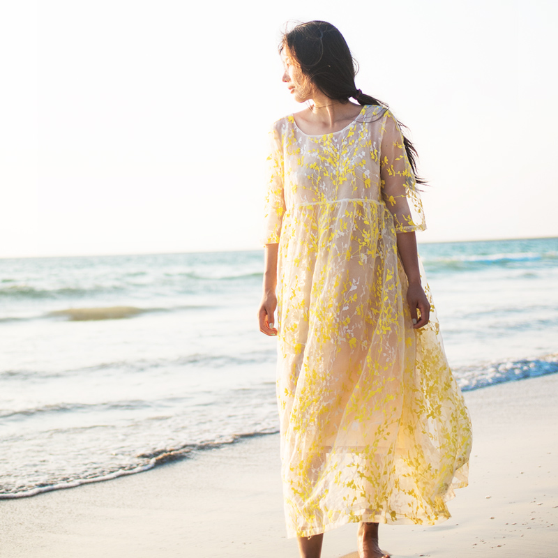 {清仓}夏小黄花蕾丝欧根纱连衣裙仙女娃娃裙宽松高腰长裙海边度假