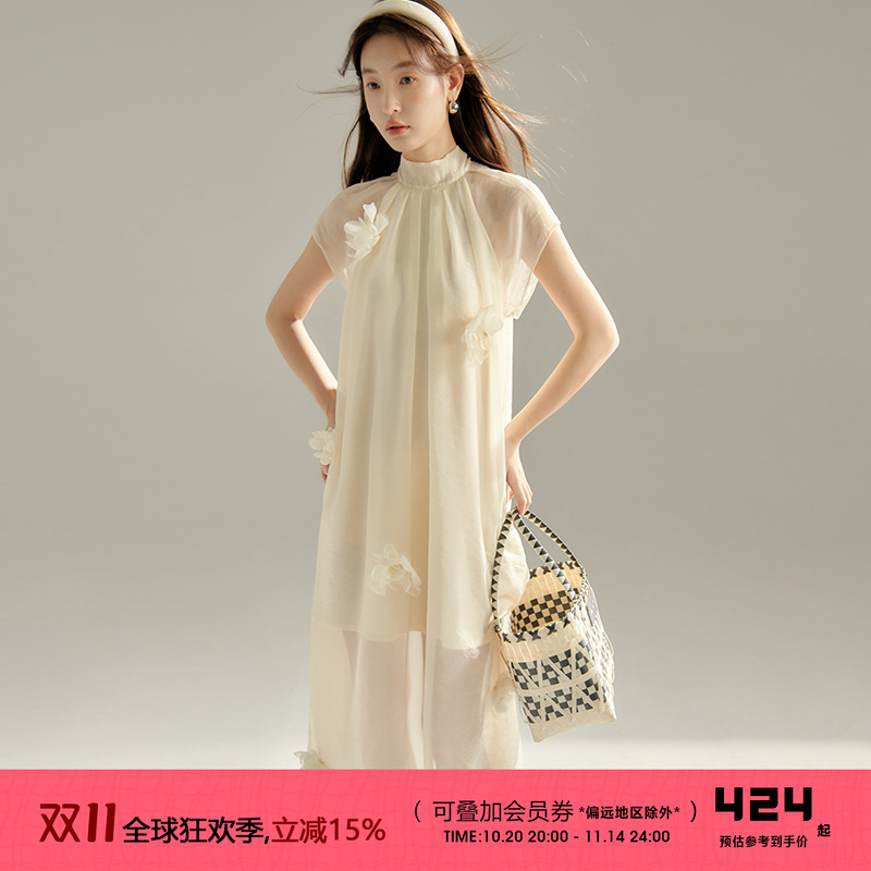 有耳uare原创设计 下凡是可以的吗 立体手工花欧根纱短袖连衣裙