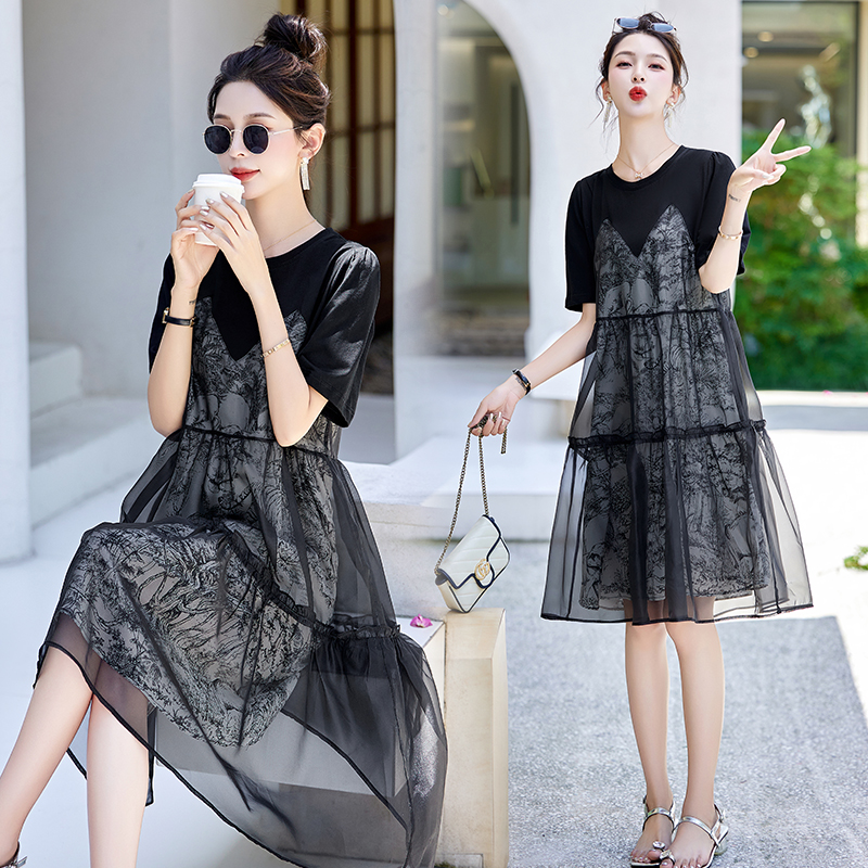 网纱印花连衣裙2025夏季新款气质高级感欧根纱显瘦假两件宽松裙子