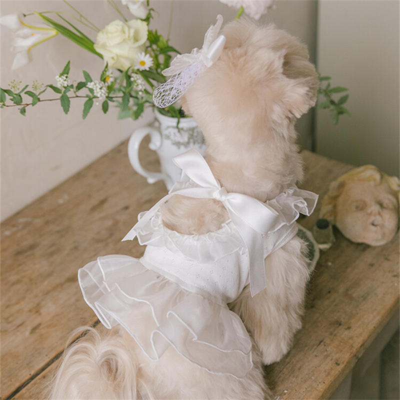 2025夏宠物针织欧根纱蝴蝶结荷叶边公主风连衣裙芭蕾裙+头饰