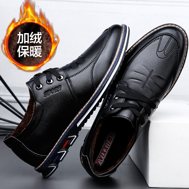 2022新款男鞋冬季潮鞋休闲皮鞋男士尖头英伦韩版百搭加绒保暖鞋子