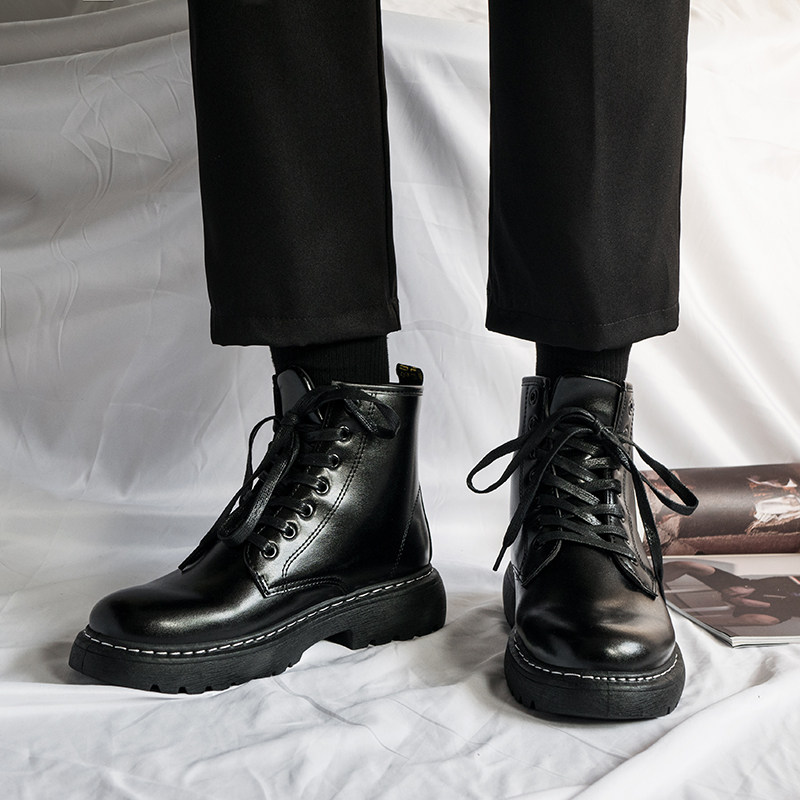 冬季男士a黑色系带马丁靴男中高帮百搭 学生车缝线韩版鞋子皮鞋潮