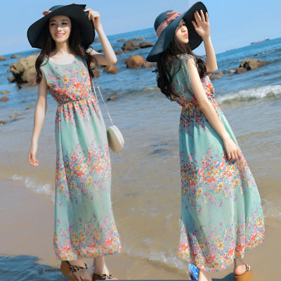 a2/18 波西米亚长裙沙滩裙碎花雪纺裙海边渡假裙棉绸背心连衣裙夏