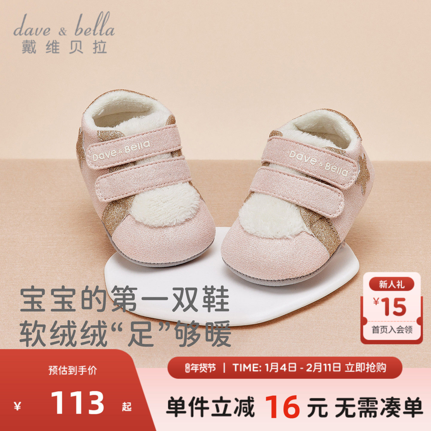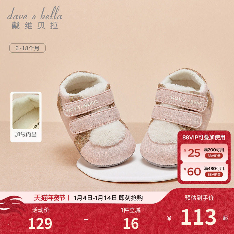 戴维贝拉婴儿软底棉鞋加绒步前鞋女童新款冬季新生儿女宝鞋子保暖