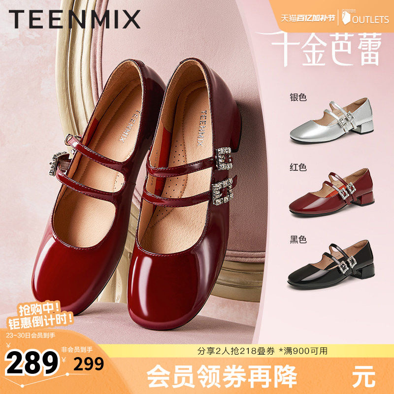 天美意千金芭蕾复古红色玛丽珍小皮鞋高跟鞋女鞋新款粗跟浅口单鞋